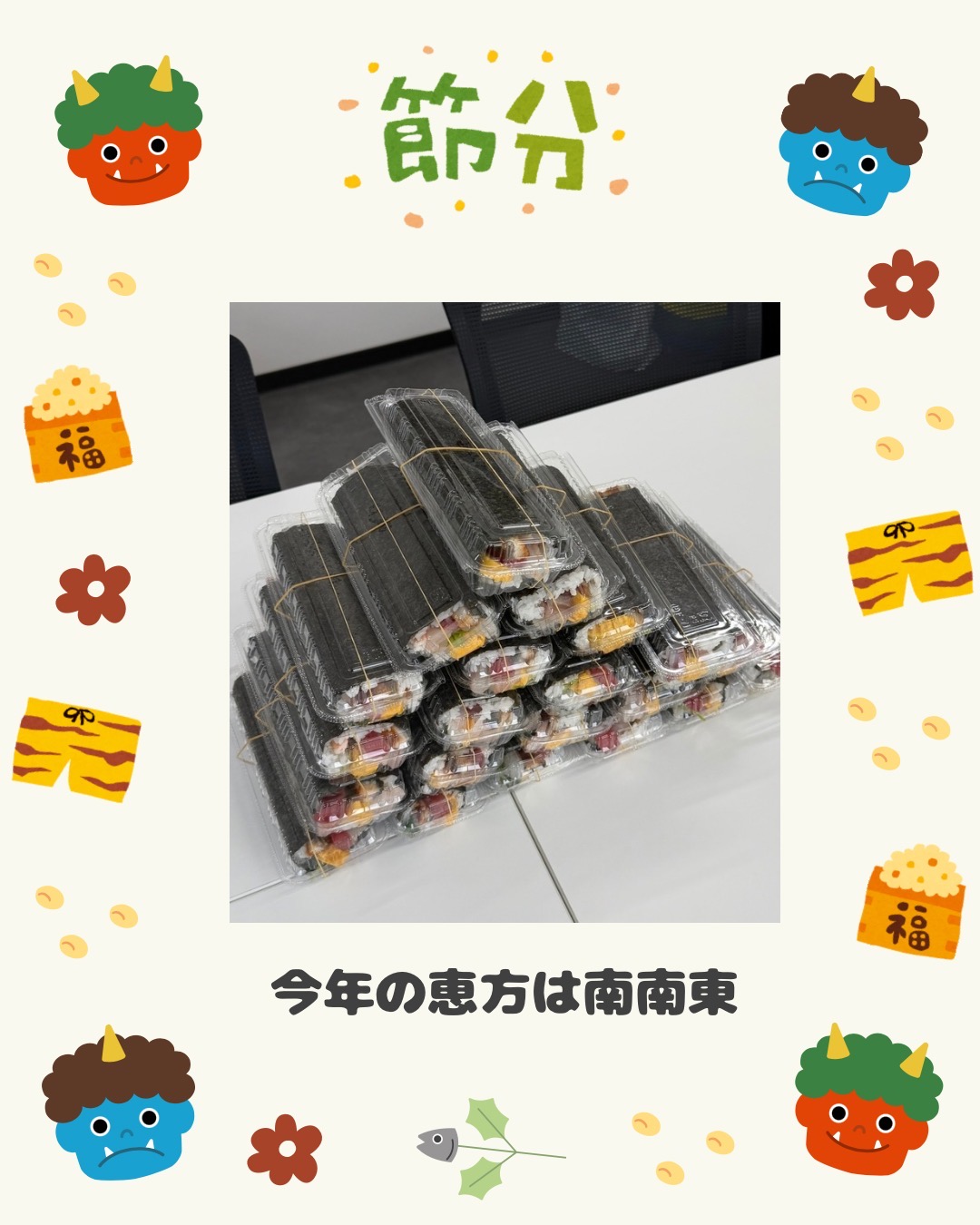 社員みんなに福が舞い込みますようにと願い毎年、節分の日に恵方巻を配っています👹